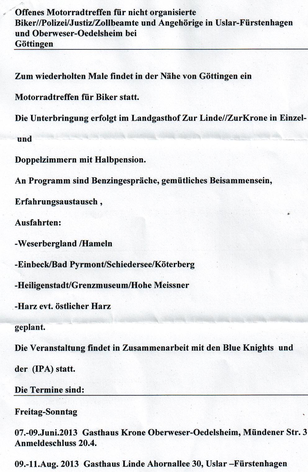 Das Polizeipräsidium Nordhessen hat mit den anliegenden Schreiben zu offenen Motorradtreffen im Sommer 2013 eingeladen und dabei auch die "Justizler" angesprochen.