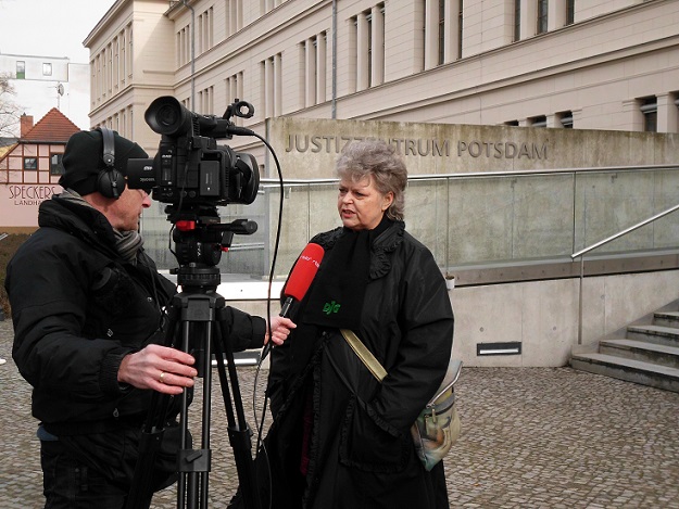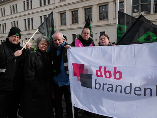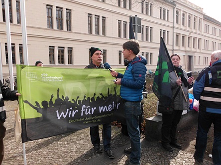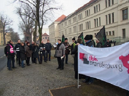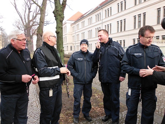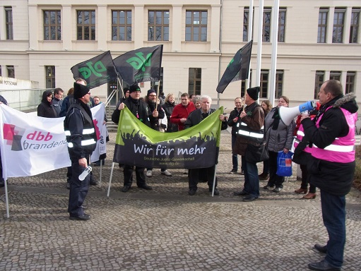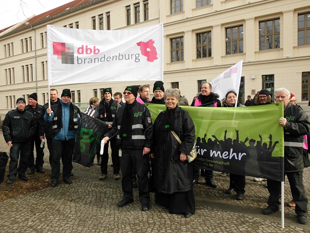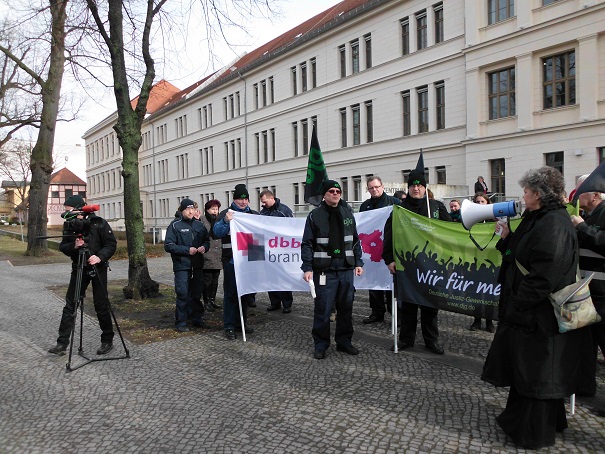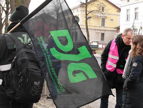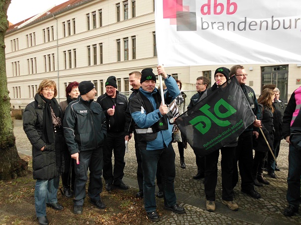 Etwa 30 Kolleginnen und Kollegen aus Brandenburg und Berlin traten am 24. Februar 2015 vor dem Potsdamer Justizzentrum in den Warnstreik und machten in „bewegten Mittagspausen“ auf die drängenden Probleme in ihrem Arbeitsfeld aufmerksam: Arbeitsverdichtung, hoher und langer Krankenstand, Personalabbau.